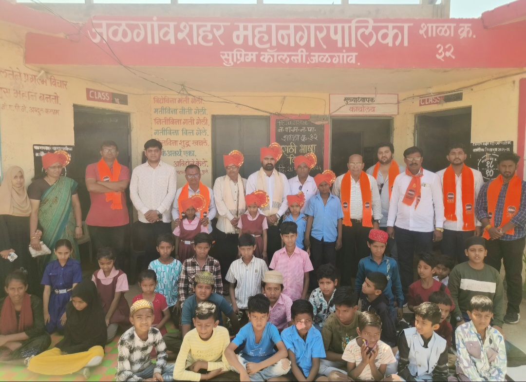 जळगाव | प्रतिनिधी : मराठी राजभाषा गौरव दिनानिमित्त महाराष्ट्र नवनिर्माण सेनाच्या वतीने जळगाव महानगरपालिका संचालित मराठी मुलांची शाळा क्रमांक ३२ येथे विशेष आणि स्तुत्य उपक्रमाचे आयोजन करण्यात आले. पक्षप्रमुख राज ठाकरे यांच्या आदेशानुसार मराठी भाषेचा अभिमान आणि प्रसार करण्याच्या उद्देशाने शिक्षक व विद्यार्थ्यांचे पारंपरिक पद्धतीने स्वागत करण्यात आले.