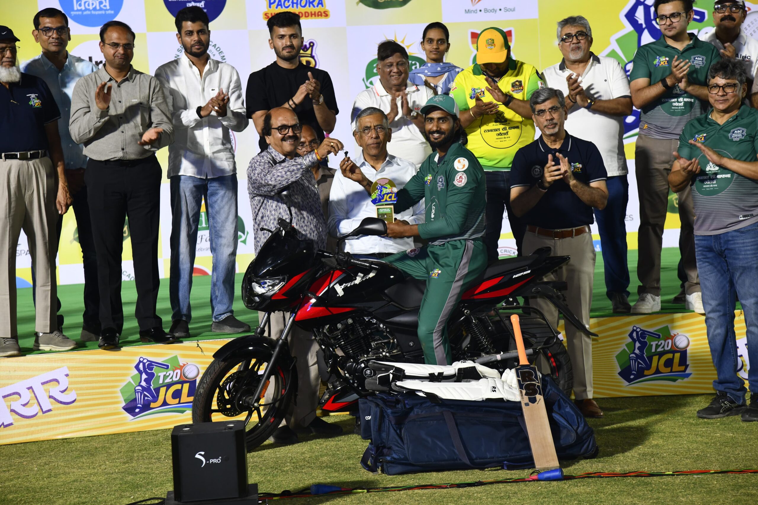 अमळनेर सुहांस जायंटचा शुभम शर्मा ला प्लेअर ऑफ द लीग म्हणून पल्सर मोटारसायकल, बॅट, पॅड्स, ग्लोव्हज, किट बॅग व ट्रॉफी